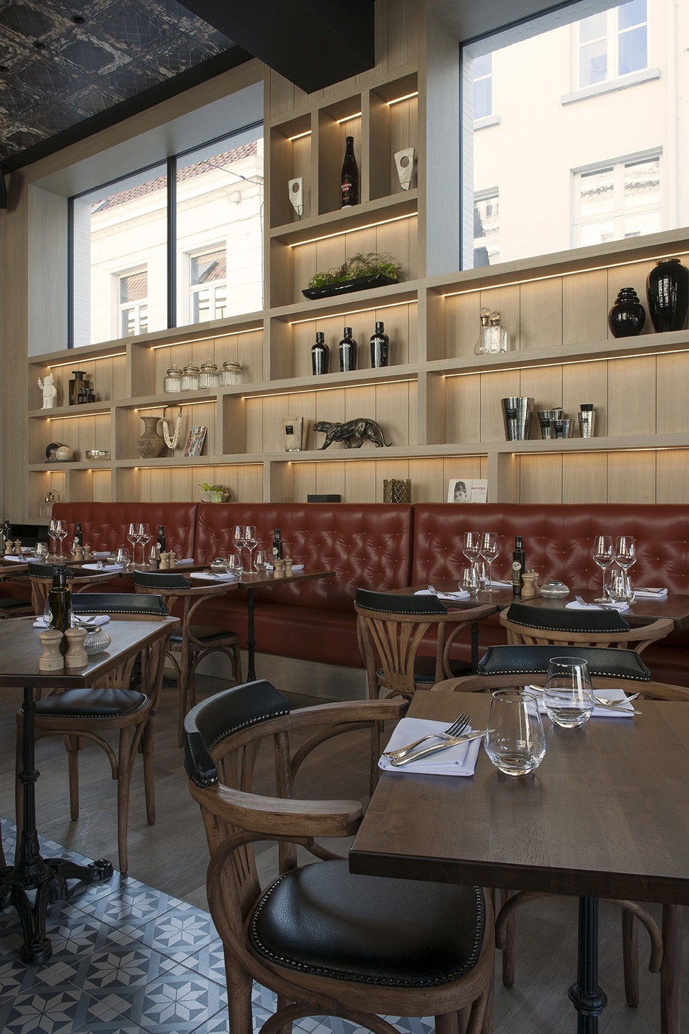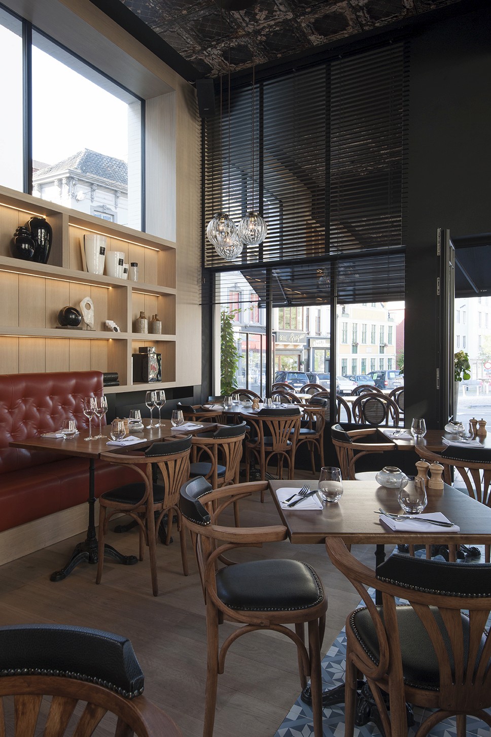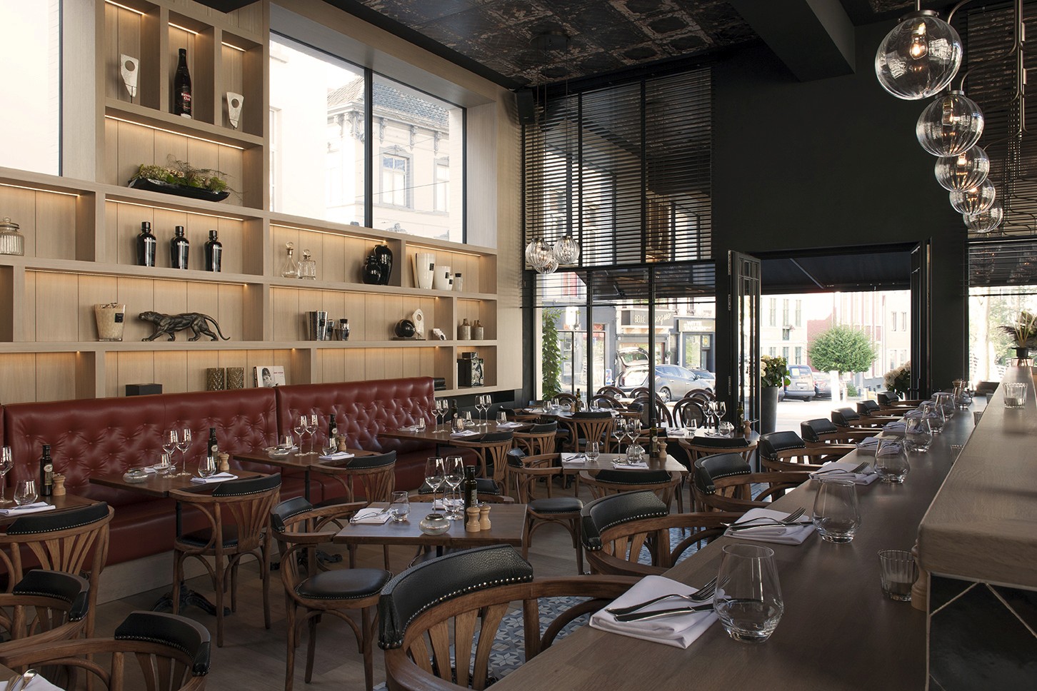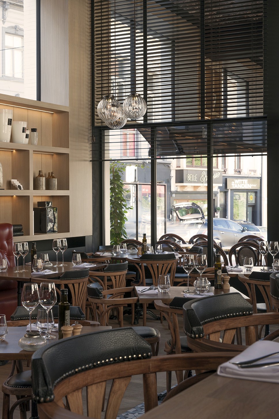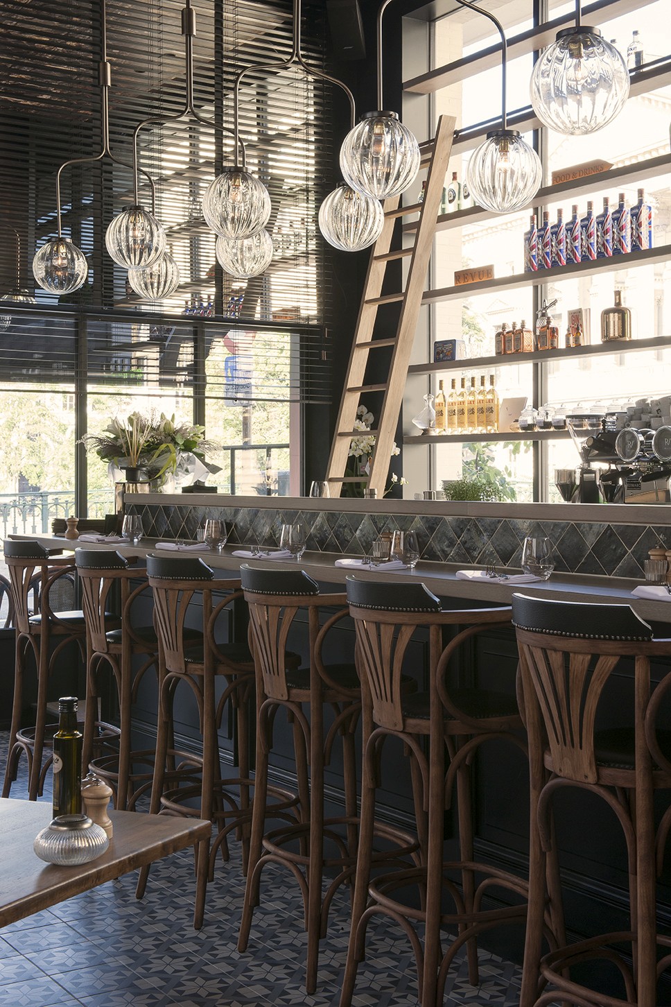 Voor Restaurant Revue in Gent verzorgde Sonneville Decorateurs, in opdracht van Interieurbureau Wille, het volledige schilderwerk.
