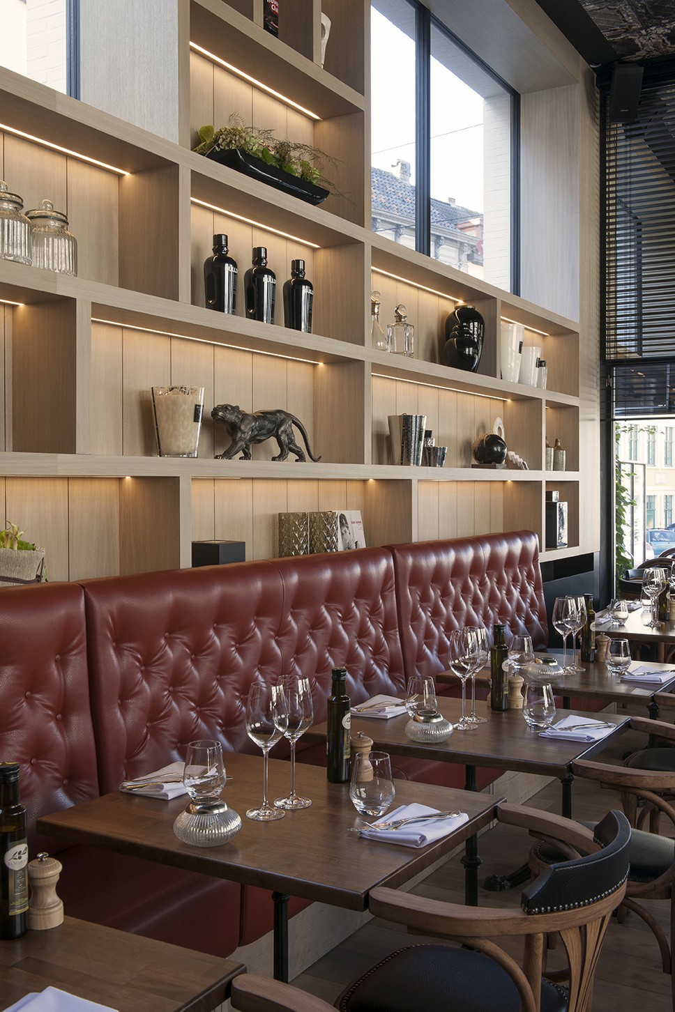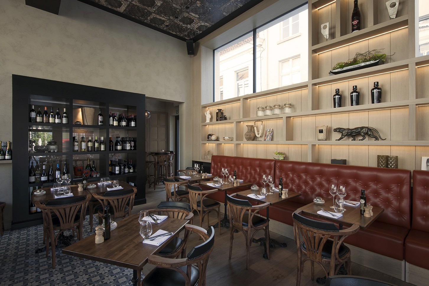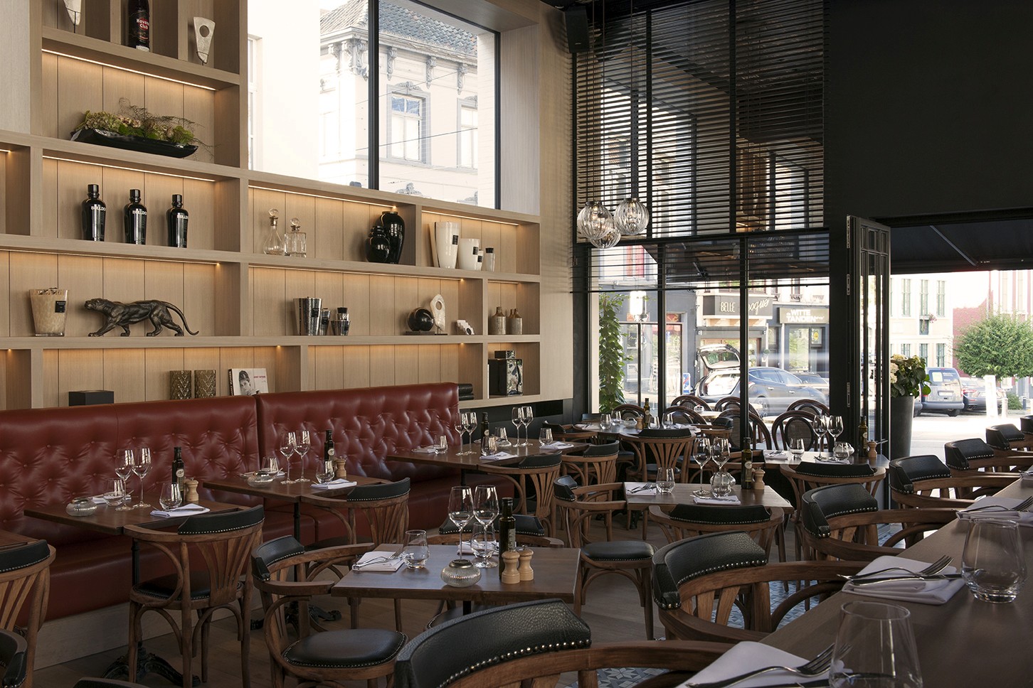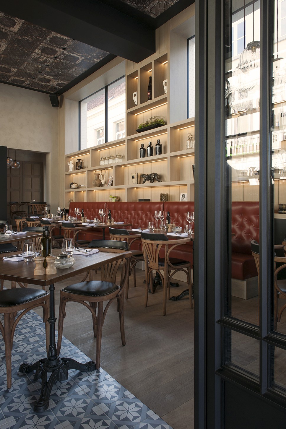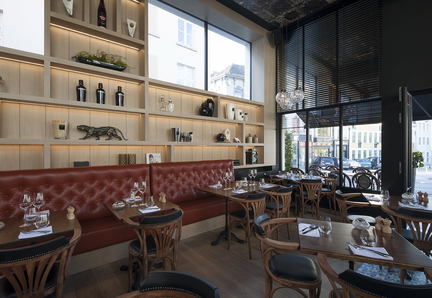 Voor Restaurant Revue in Gent verzorgde Sonneville Decorateurs, in opdracht van Interieurbureau Wille, het volledige schilderwerk.