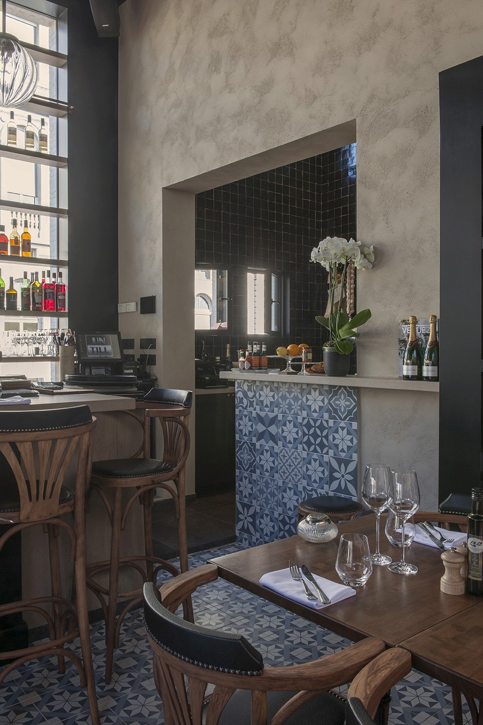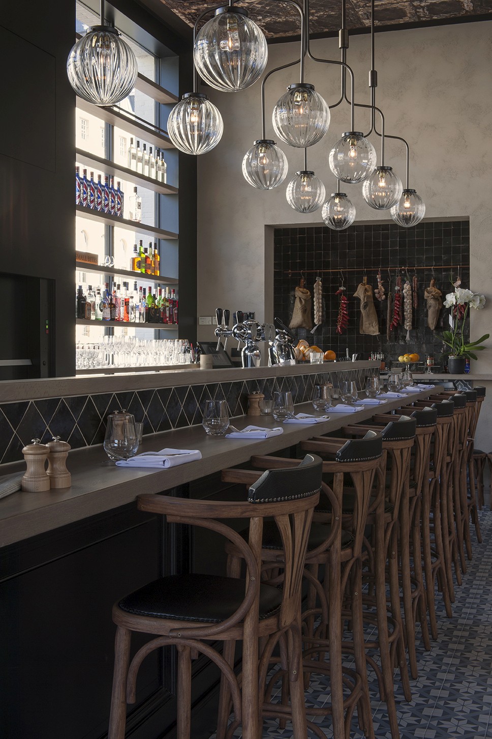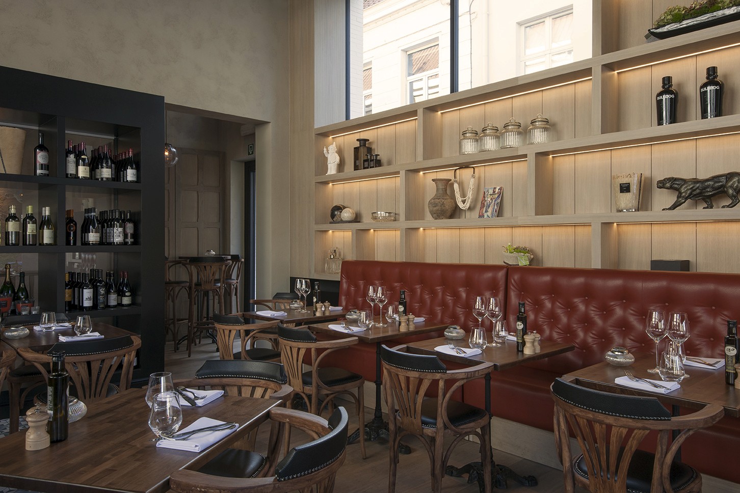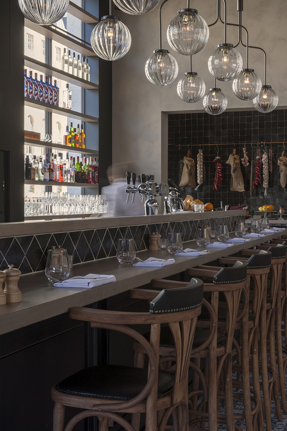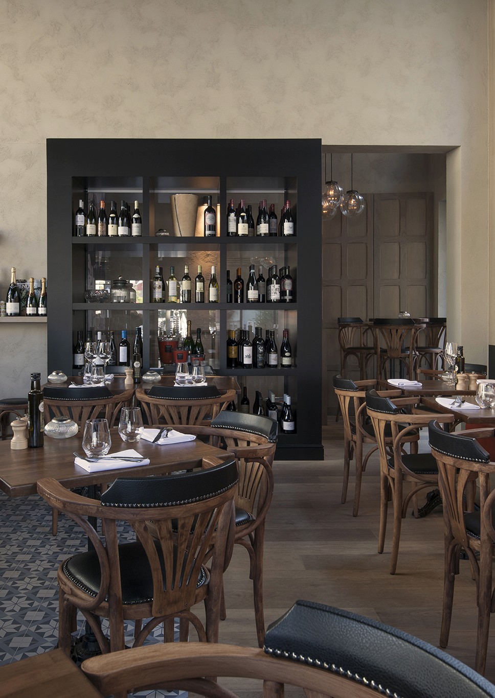 Voor Restaurant Revue in Gent verzorgde Sonneville Decorateurs, in opdracht van Interieurbureau Wille, het volledige schilderwerk.