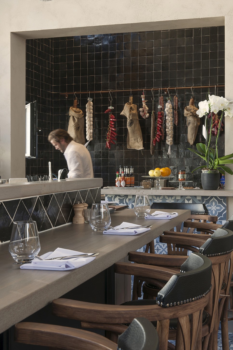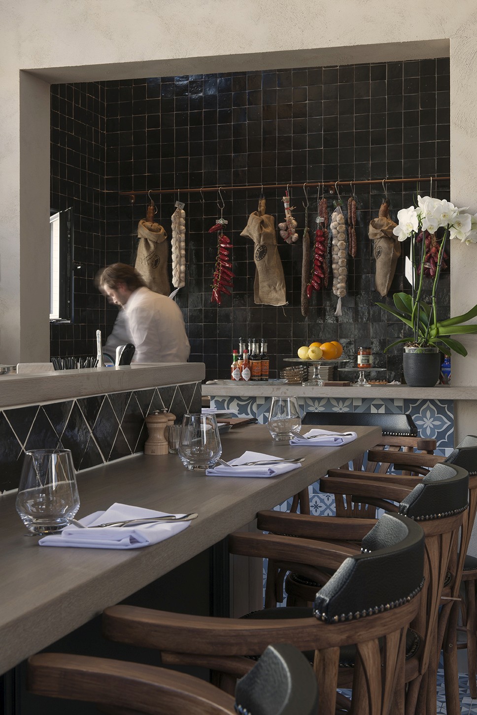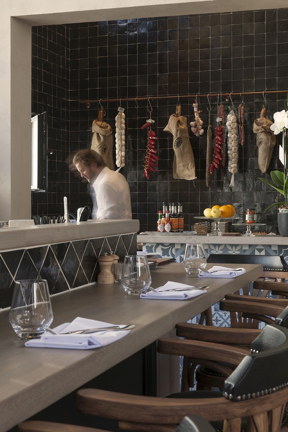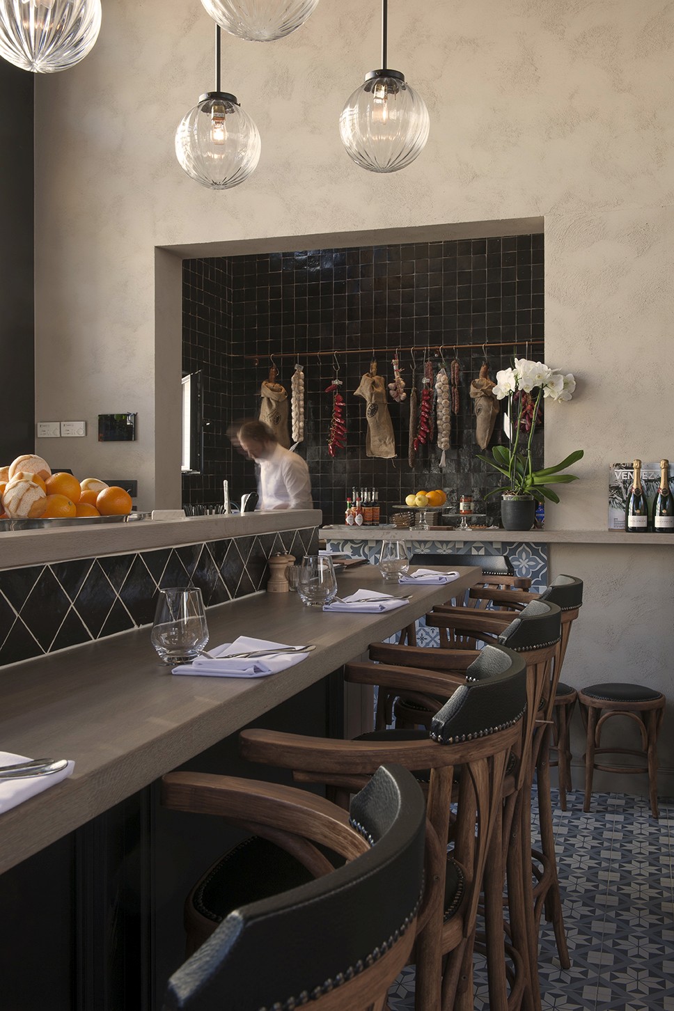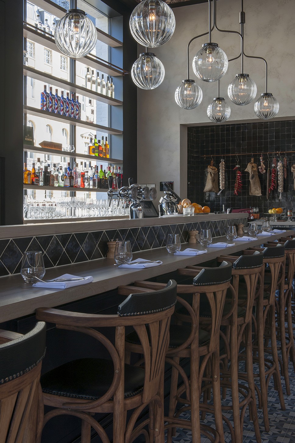 Voor Restaurant Revue in Gent verzorgde Sonneville Decorateurs, in opdracht van Interieurbureau Wille, het volledige schilderwerk.